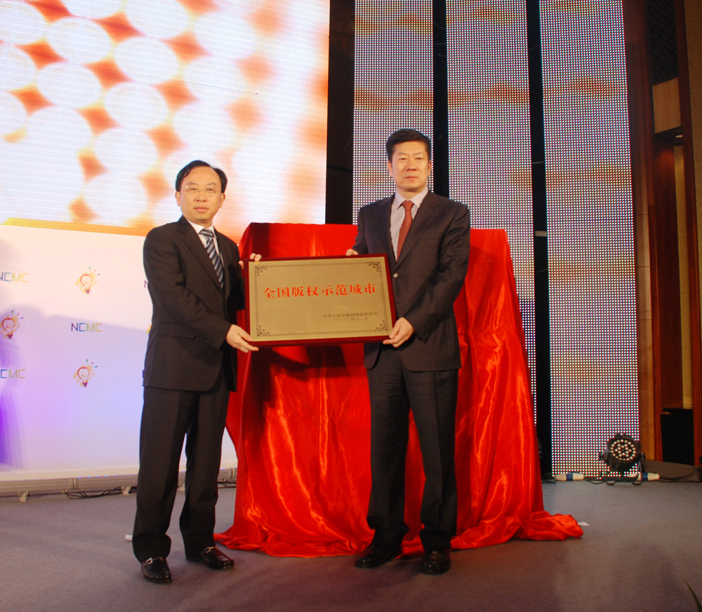 新闻出版总署副署长、国家版权局副局长阎晓宏向成都市副市长谢瑞武授“全国版权示范城市”牌匾