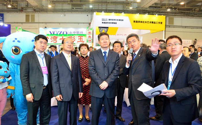 国家新闻出版广电总局(国家版权局)副局长阎晓宏(前排左三)、山东省副省长季缃绮(前排左二)出席开幕仪式并参观交易会展区。