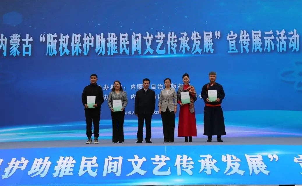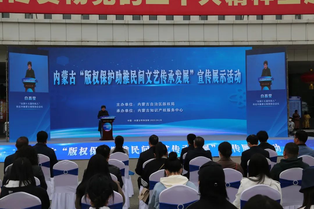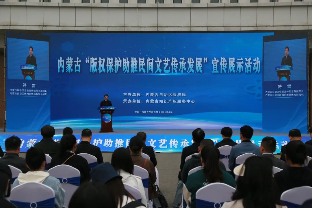 4月26日,在第23个世界知识产权日到来之际,为深入贯彻落实习近平总书记关于加强知识产权工作的重要指示,大力营造浓厚的版权保护氛围,激发内蒙古民间文艺创新创造活力。由内蒙古自治区版权局主办,内蒙古知识产权服务中心承办的内蒙古“版权保护助推民间文艺传承发展”宣传展示活动在呼和浩特市举办。内蒙古自治区党委宣传部常务副部长、自治区新闻出版局(版权局)局长符雷出席活动并致辞,内蒙古自治区党委宣传部副部长田瑞华、内蒙古文联党组书记、主席冀晓青等出席活动。